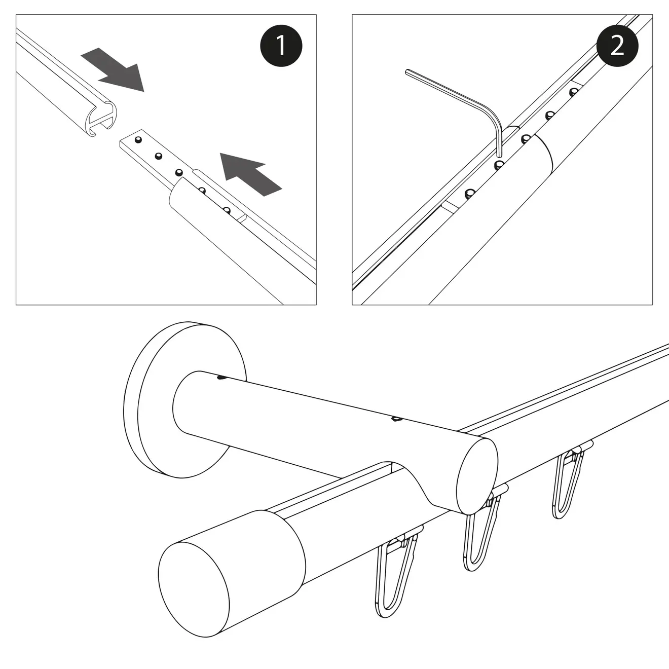 Łącz kilka karniszy z wewnętrzną szyną według potrzeb, wkładając łącznik w dyskretnie ukryty profil prowadzący na górze karniszy. W zestawie znajdują się cztery śruby, które po dokręceniu zapewniają solidne i niewidoczne połączenie karniszy. Dzięki łącznikowi możesz łatwo dopasować długość swoich karniszy.
