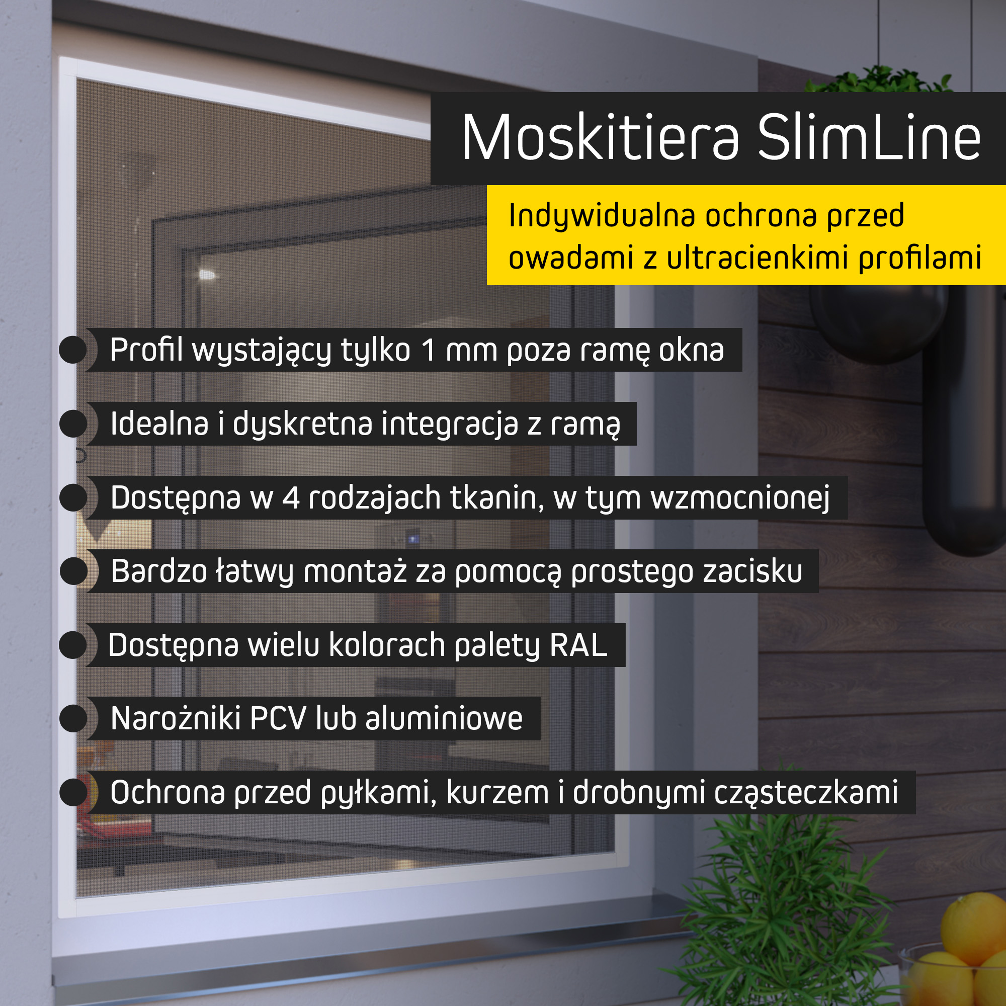 Moskitiera SlimLine wykonana jest z lekkiego, lecz bardzo wytrzymałego aluminium, odpornego na deszcz, wysokie temperatury i wiatr. Starannie zaprojektowana konstrukcja oraz wysokiej jakości elementy montażowe gwarantują szczelność i trwałość produktu.