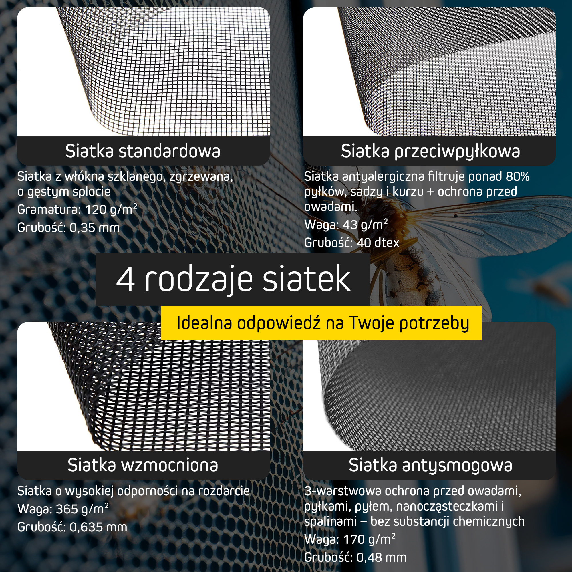 Nasze siatki to coś więcej niż tylko ochrona przed owadami. Możesz wybrać spośród czterech rodzajów siatek: