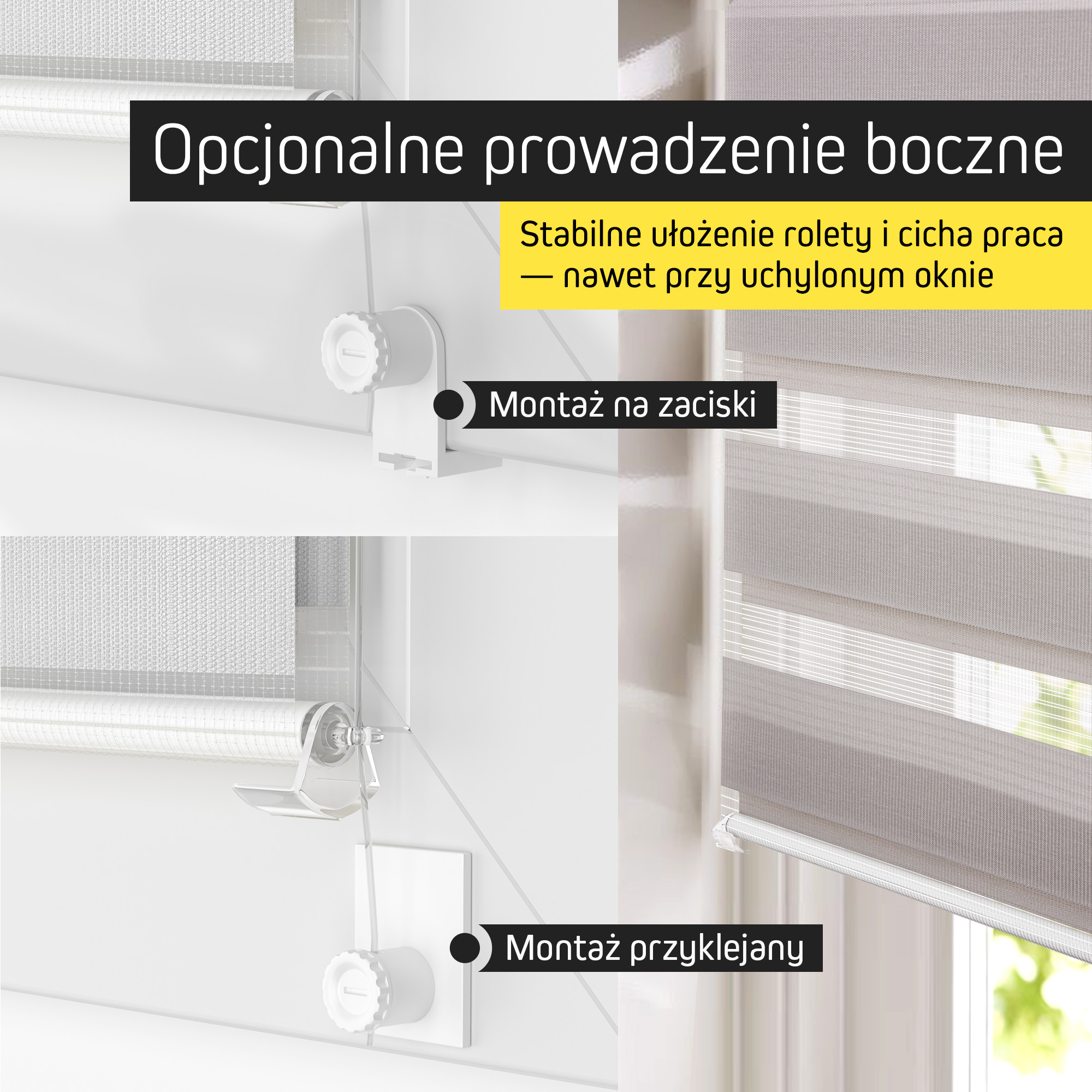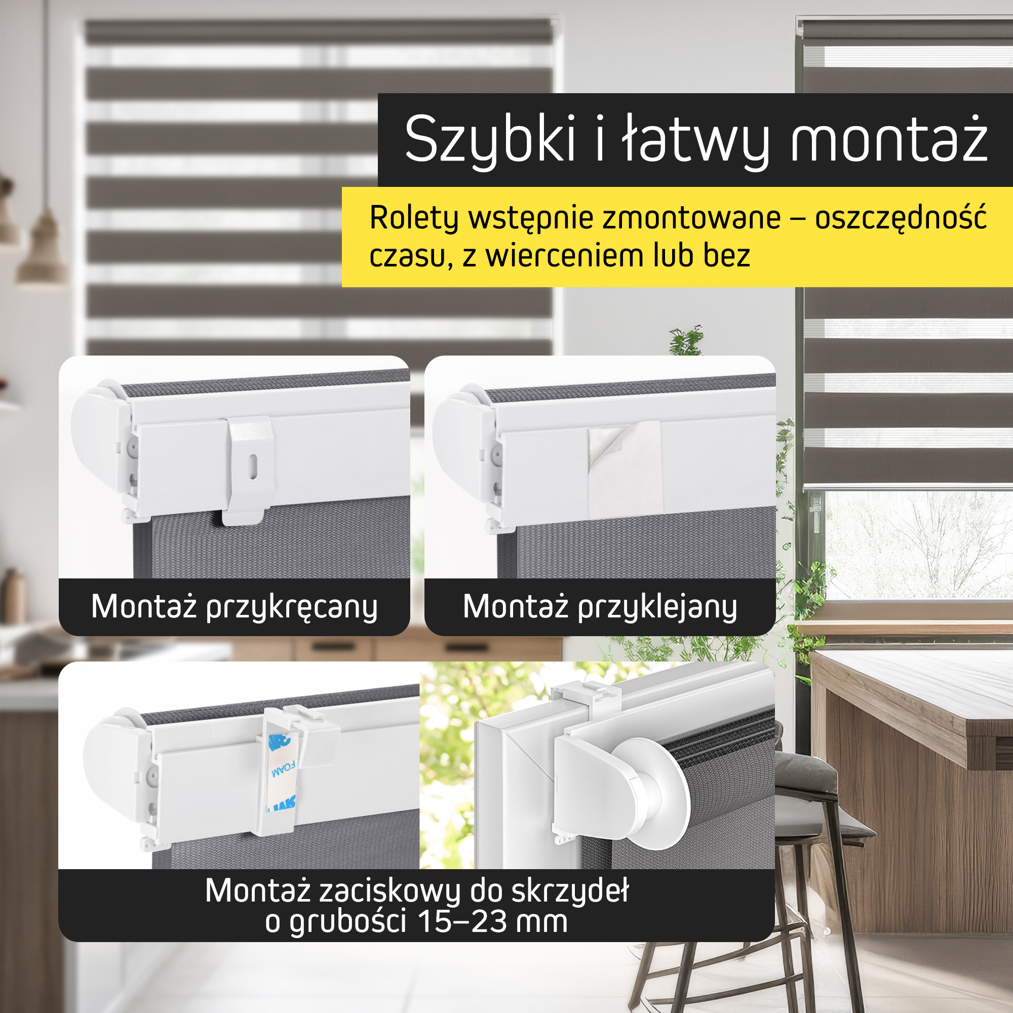 Roleta dzień i noc Eco daje pełną swobodę wyboru sposobu montażu — możesz ją przykręcić, zamocować na uchwytach zaciskowych lub przykleić. Dzięki temu instalacja jest szybka, prosta i dopasowana do Twoich potrzeb.