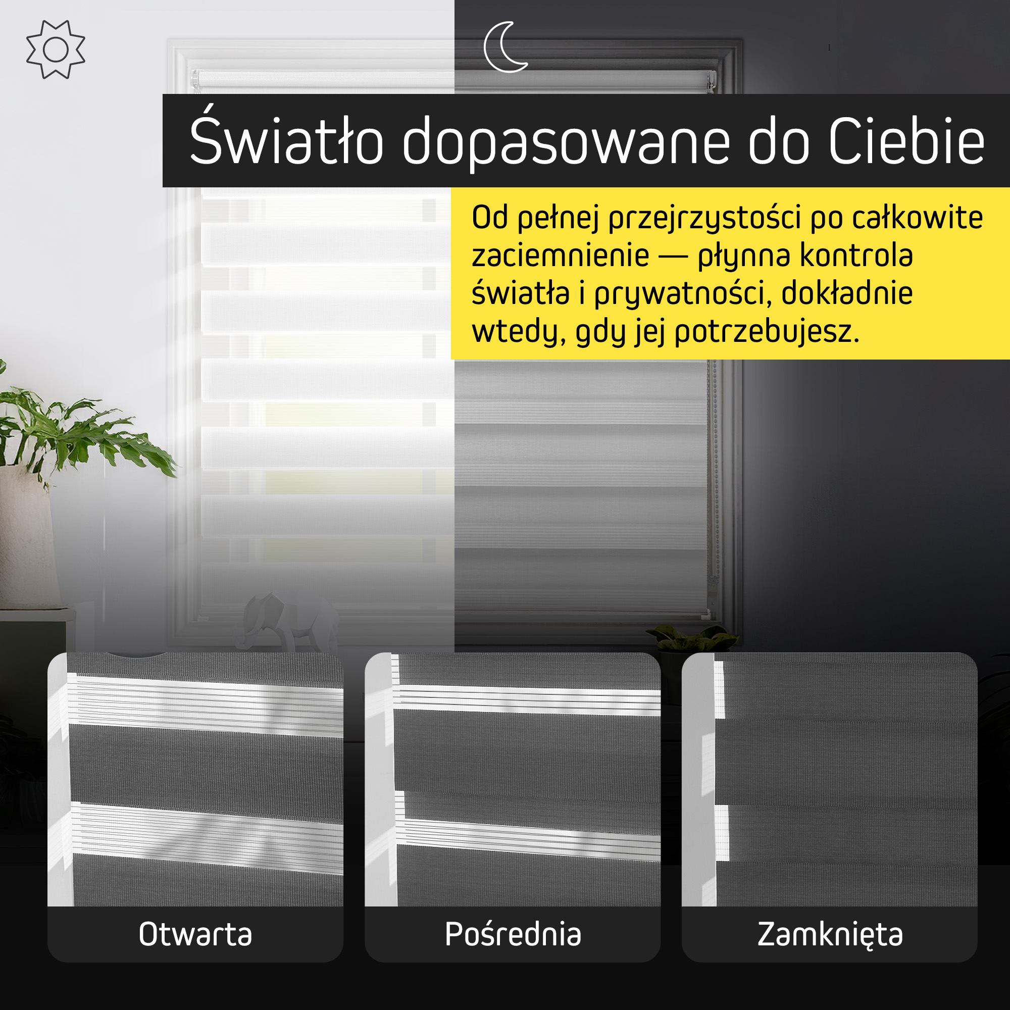 Roleta dzień i noc Eco na wymiar została zaprojektowana tak, aby zapewnić pełną kontrolę nad ilością światła we wnętrzu. Tkanina składa się z naprzemiennych pasów – transparentnych i zaciemniających – które przesuwają się względem siebie, dzięki czemu łatwo ustawisz idealny poziom doświetlenia o każdej porze dnia.