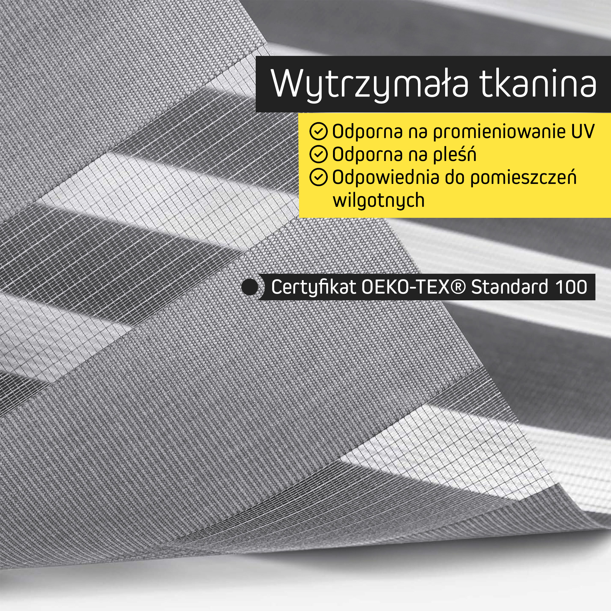 Tkaniny stosowane w naszych roletach dzień i noc Eco zostały stworzone z myślą o wieloletnim użytkowaniu. Dzięki specjalnej powłoce są odporne na intensywne promieniowanie UV, co chroni materiał przed blaknięciem i odkształceniami. Dodatkowo wykazują wysoką odporność na wilgoć, dzięki czemu doskonale sprawdzają się w różnych warunkach panujących w domu.