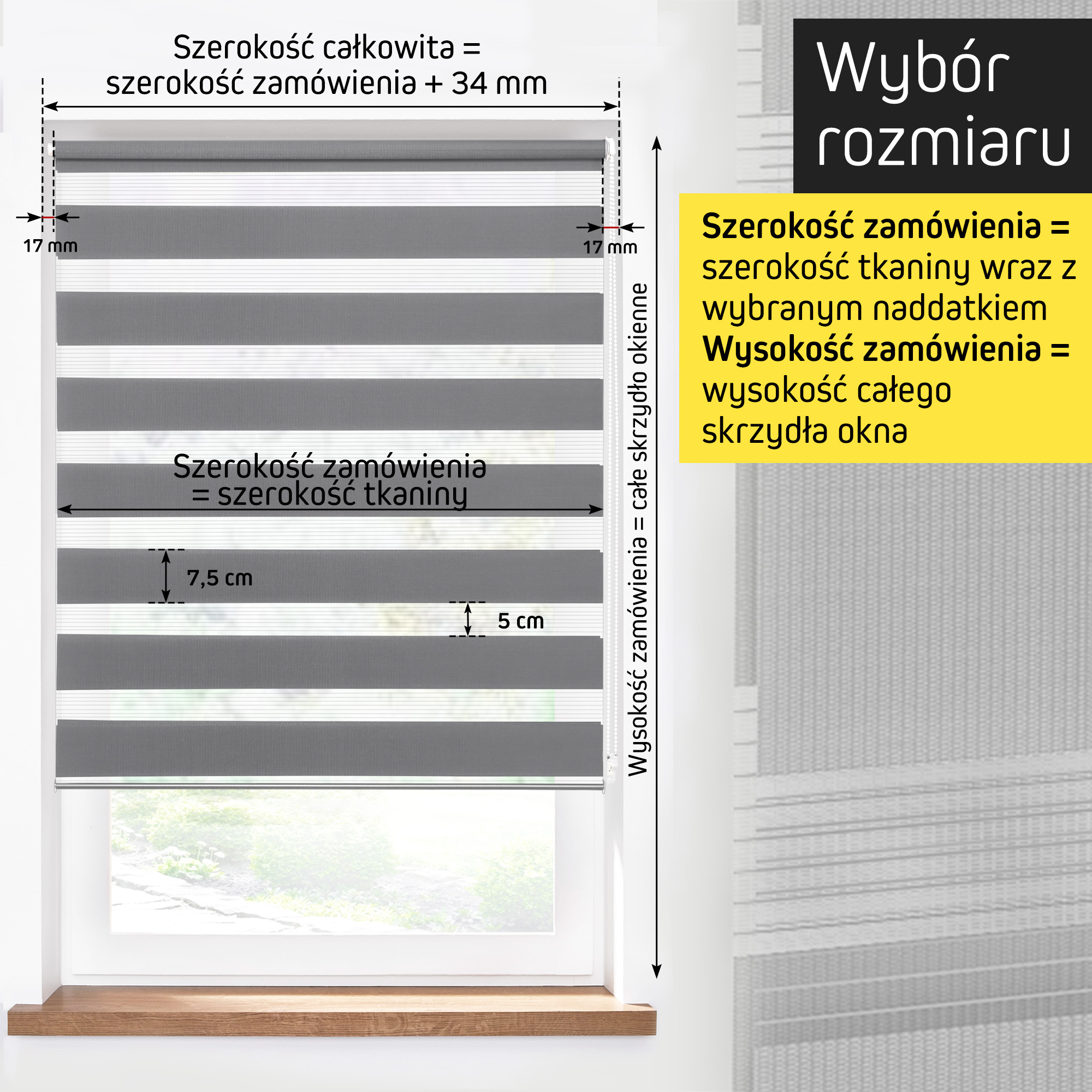 Każda roleta dzień i noc Eco na wymiar jest przygotowywana indywidualnie, zgodnie z pomiarami podanymi przez Ciebie. Dlatego tak ważne jest, aby przed złożeniem zamówienia dokładnie zmierzyć wysokość i szerokość. Jak zrobić to krok po kroku, wyjaśnia czytelna instrukcja pomiaru dostępna w konfiguratorze produktu.