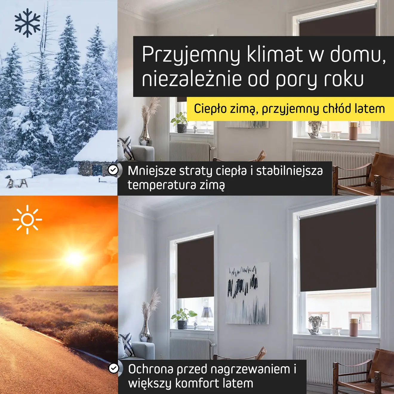 Roleta Tenebra w wersji z tkaniną termiczną posiada srebrną powłokę, która oprócz zaciemniania pełni funkcję izolacyjną – latem chroni przed nagrzewaniem pomieszczenia, a zimą ogranicza utratę ciepła. W modelu Tenebra bez właściwości termicznych zastosowano tkaninę poliestrową z tylną warstwą w tym samym kolorze co przód, zapewniającą skuteczne zaciemnienie.