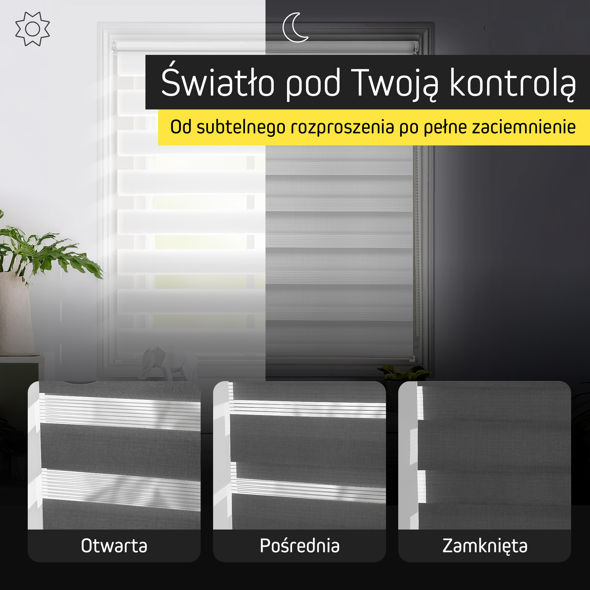 - Do wyboru tkaniny przepuszczające światło lub zaciemniające