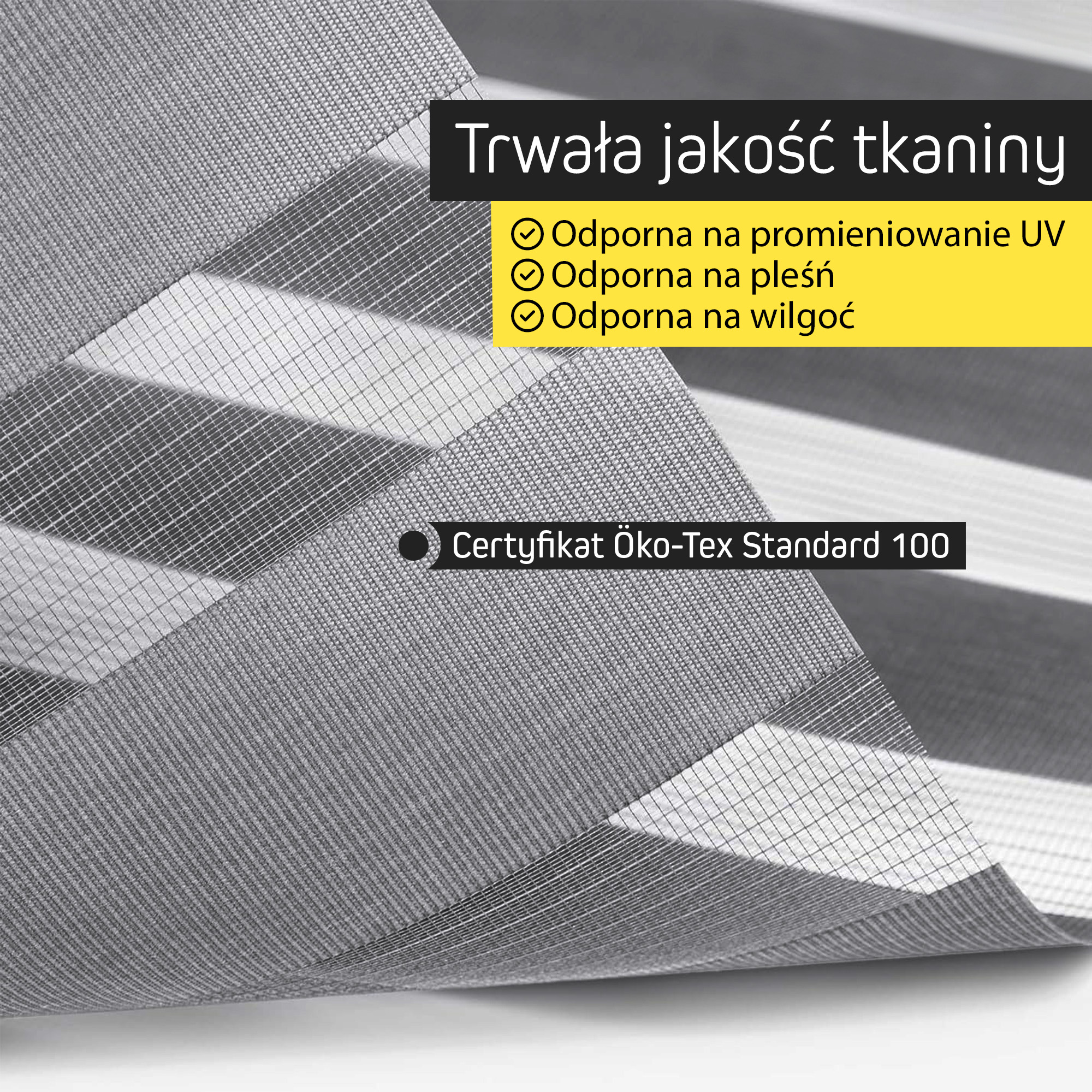 Nasze tkaniny do rolet dzień-noc są odporne na wilgoć i parę wodną, dlatego świetnie sprawdzą się również w łazience, kuchni czy innych pomieszczeniach o podwyższonej wilgotności.
