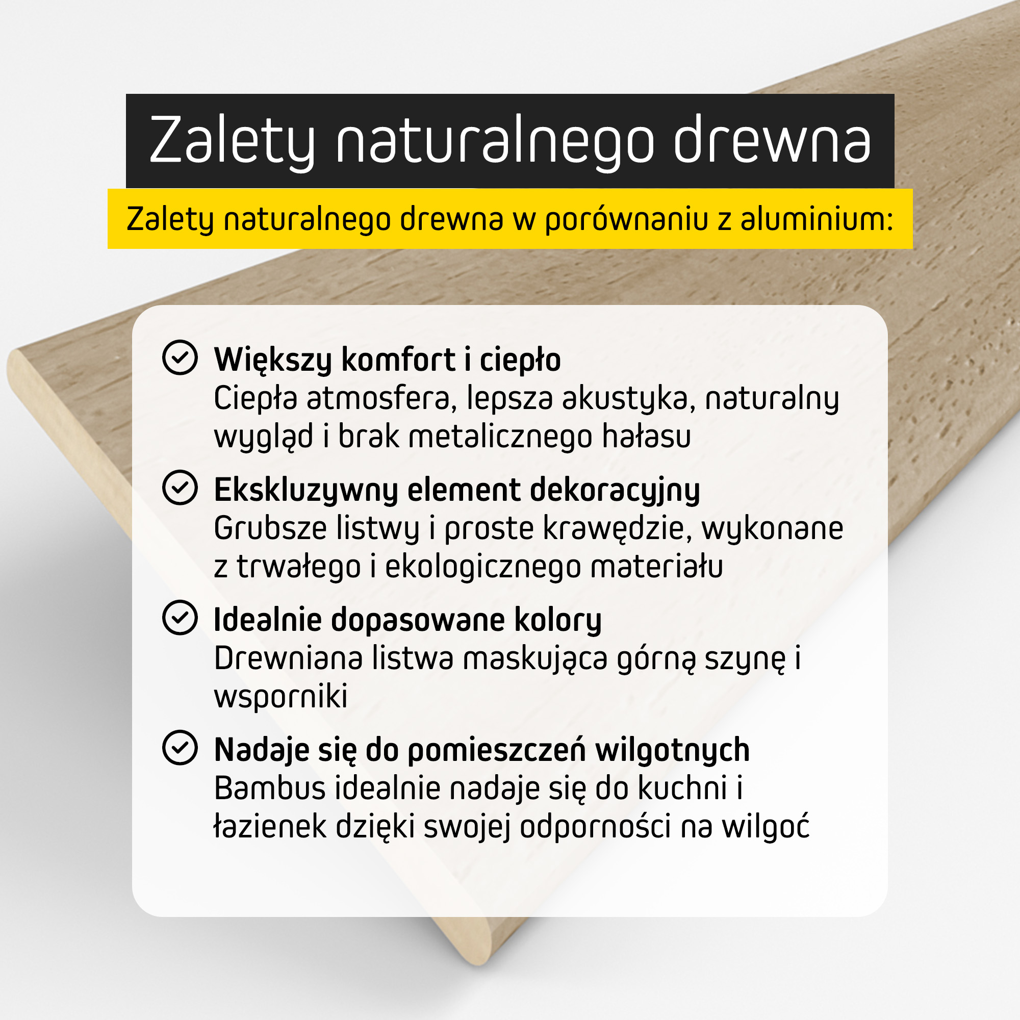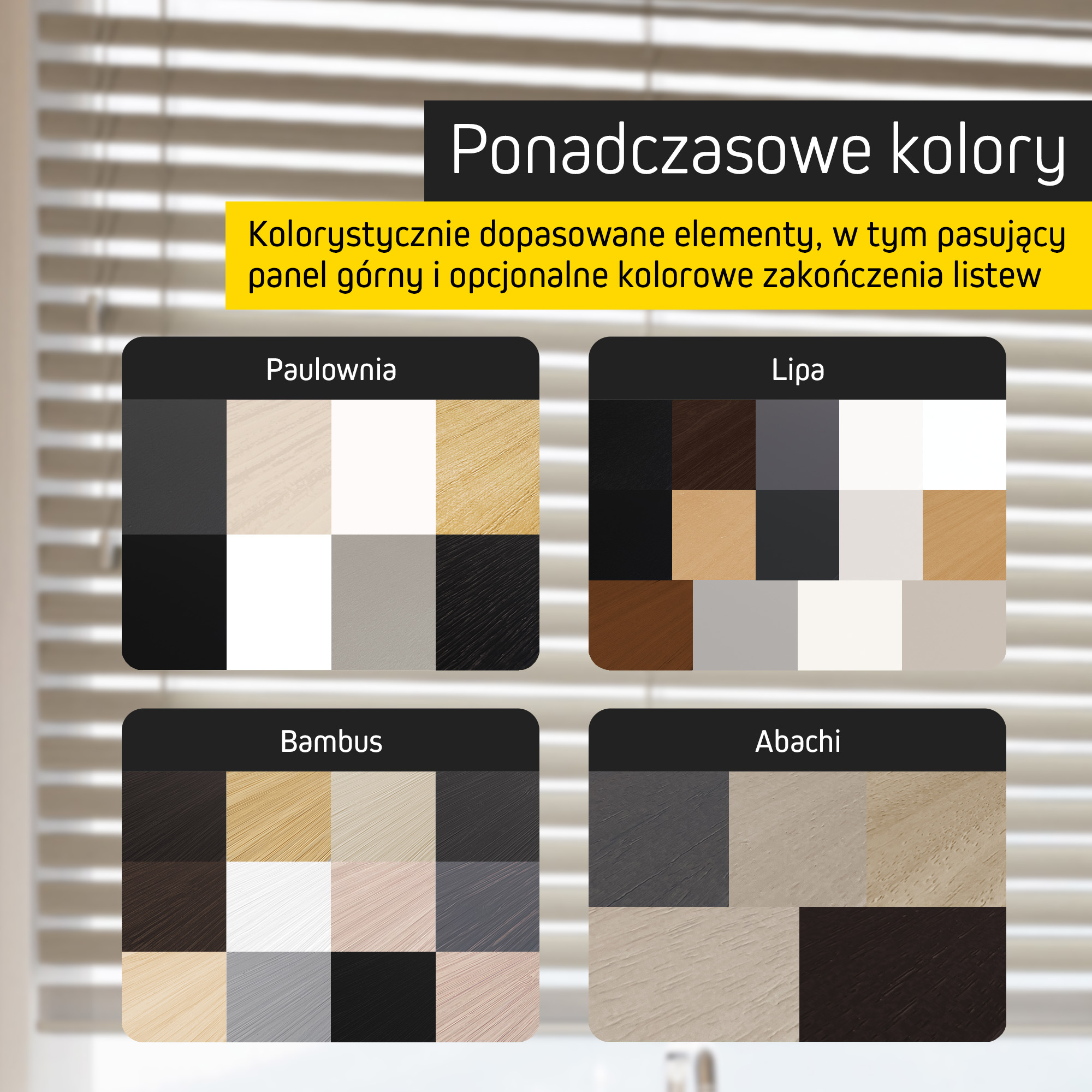 - Lamele wykonane z naturalnego, zrównoważonego surowca: drewno lub bambus