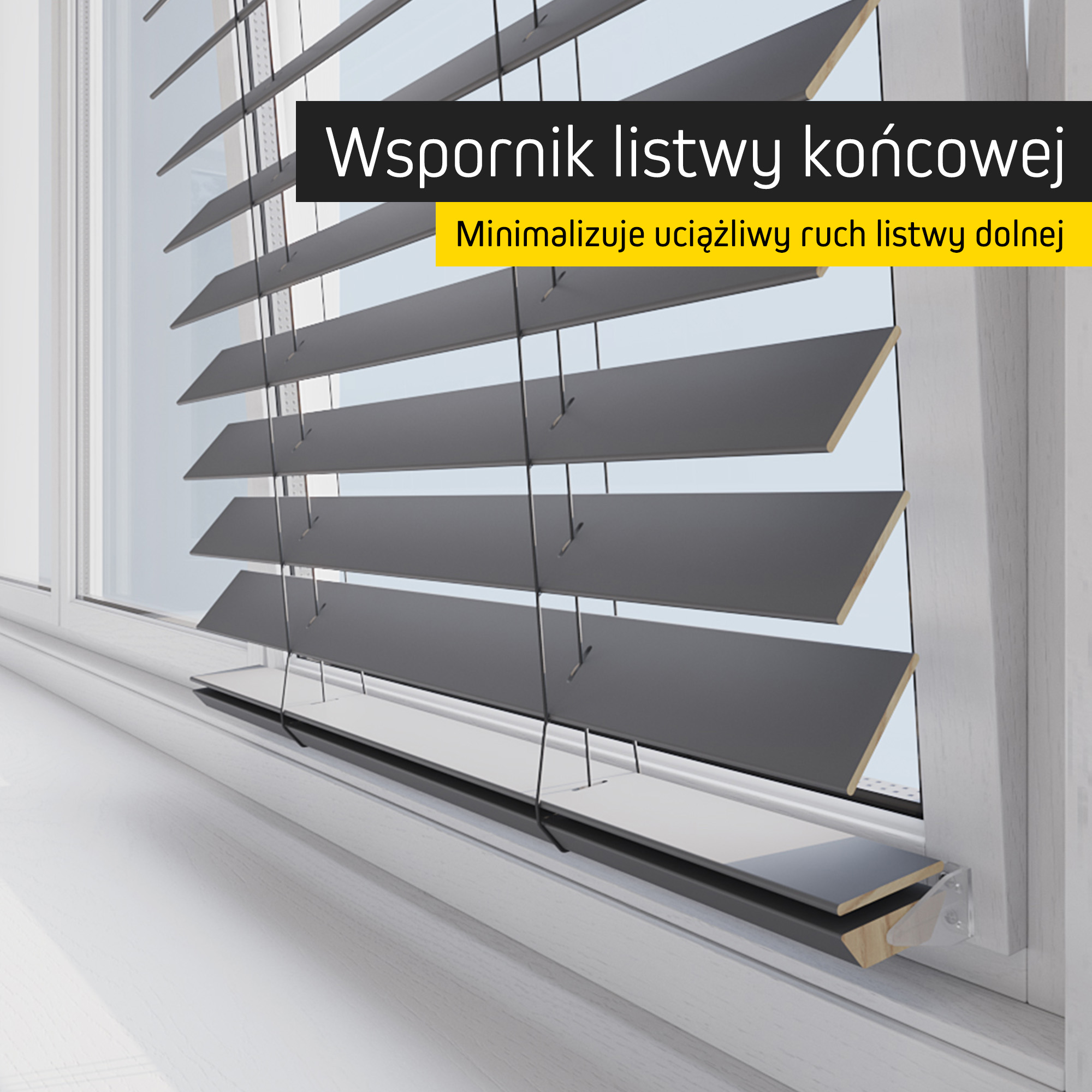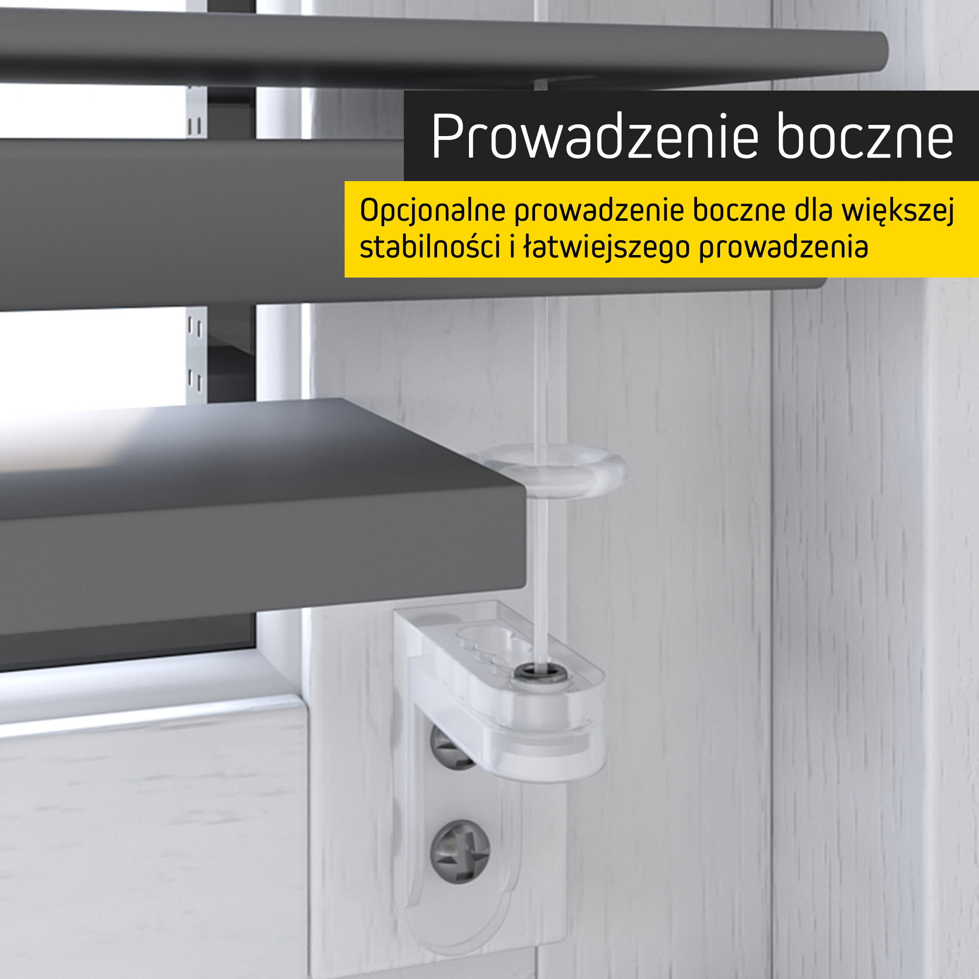 Aby żaluzje zachowywały idealną pozycję nawet przy uchylonym oknie czy lekkim przeciągu, możesz wybrać opcjonalne prowadzenie boczne, które zabezpiecza przed kołysaniem. Alternatywnie uchwyt listwy dolnej pomaga utrzymać lamele w estetycznej, stabilnej formie.