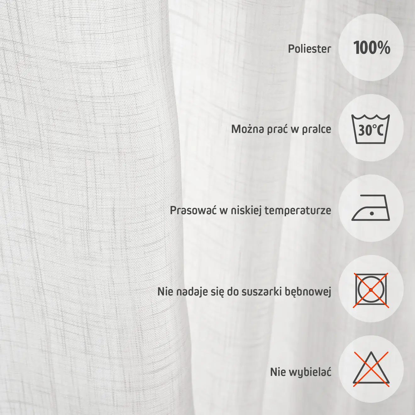 Pielęgnacja zasłony jest równie łatwa: można ją prać w pralce w delikatnym cyklu w 30 °C - bez wirowania, wieszając mokrą. Należy unikać wybielaczy, w tym chlorowych, oraz suszarki. Zasłonę można także czyścić chemicznie.
