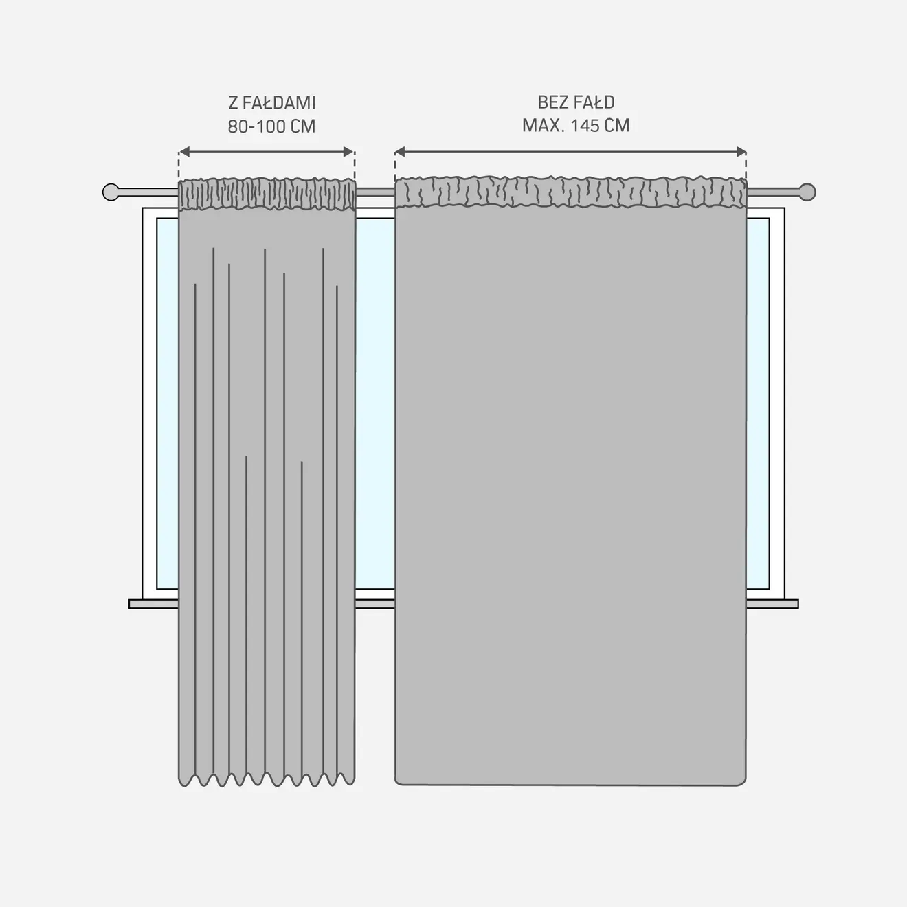 Wymiary zasłony wynoszą 145 × 245 cm. Po marszczeniu szerokość wynosi 80–100 cm, natomiast bez marszczeń osiąga do 140 cm.
